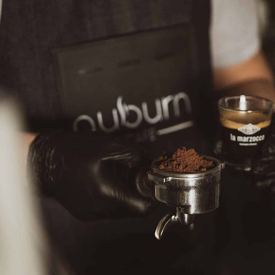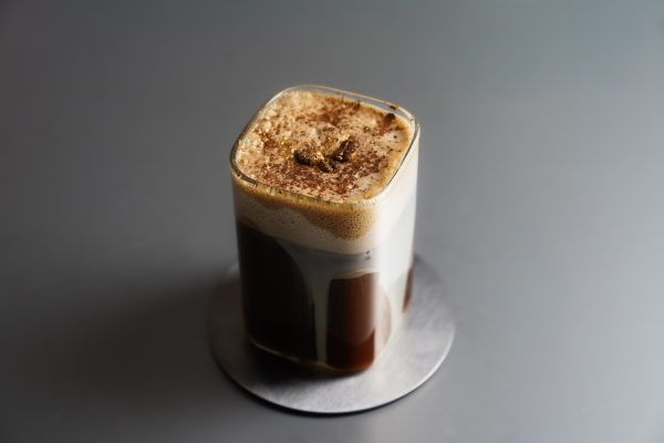 Golden iced coffee made with milk and espresso, topped with a sprinkle of edible gold.