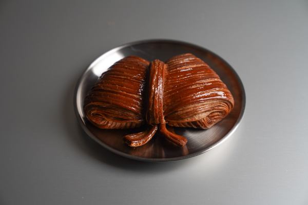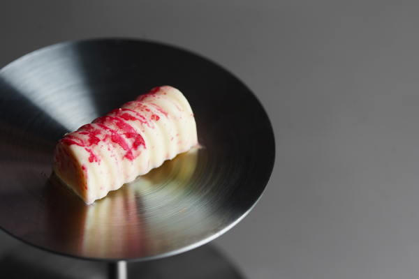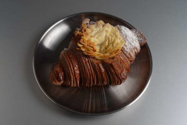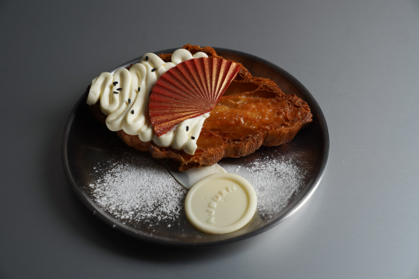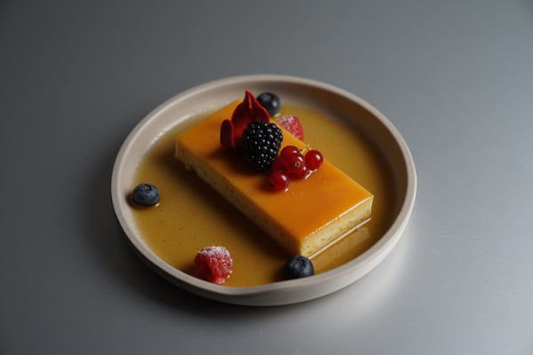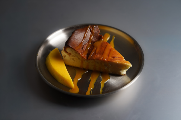Mango-flavored San Sebastian slice with a drizzle of caramel.