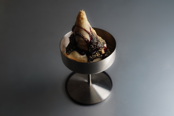 Cheesecake-flavored ice cream with blueberries and garnish.