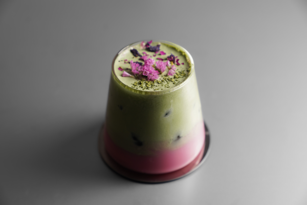 A three-layered drink made with green matcha tea, sweet lychee flavor, and topped with foam.
