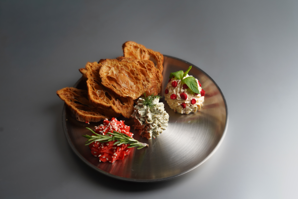 Toasted bread with burrata cheese, cherry tomatoes, herbs, and pomegranate sauce.