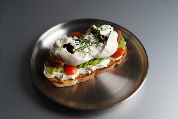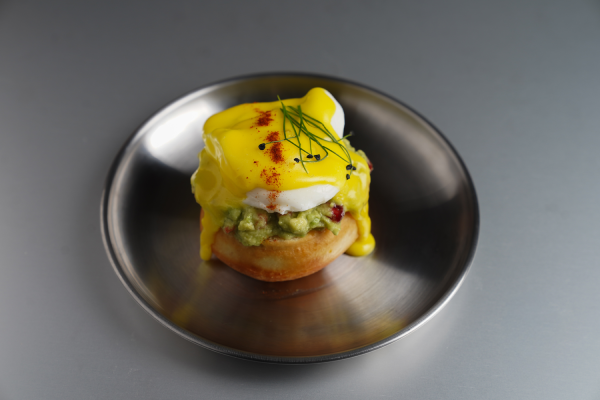 Boiled eggs with avocado Benedict, served with special sauce and English muffin.