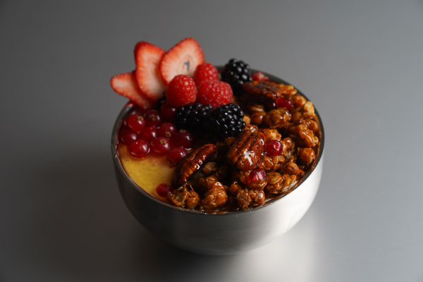 A crunchy mix of toasted oats, nuts, and honey with a hint of vanilla, served with natural dried fruits.