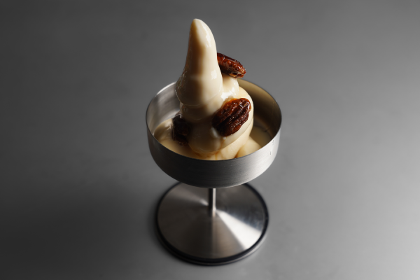 Ice cream made with yogurt, pecans, honey, and garnish.