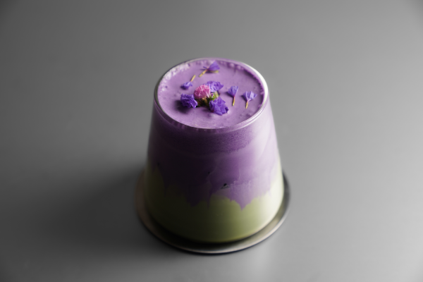 A drink made with matcha, milk, lavender syrup, and whipped cream.