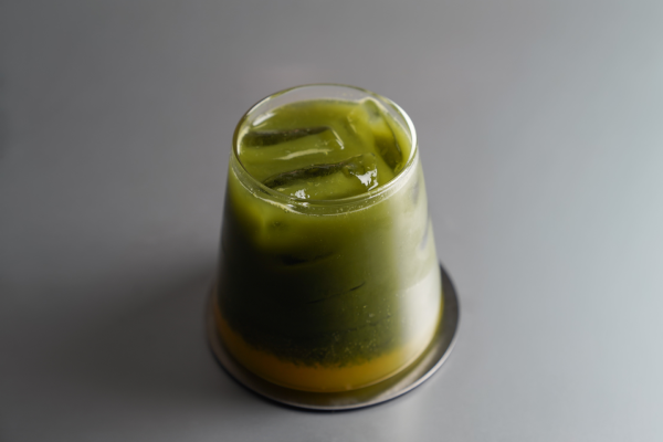 A drink made with matcha powder, orange juice, honey, and sparkling water.