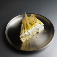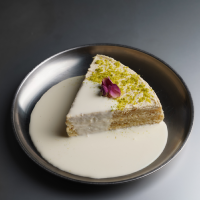 Cake made with rahash, vanilla, and arabic coffee, garnished with pistachios and served with rahash sauce.